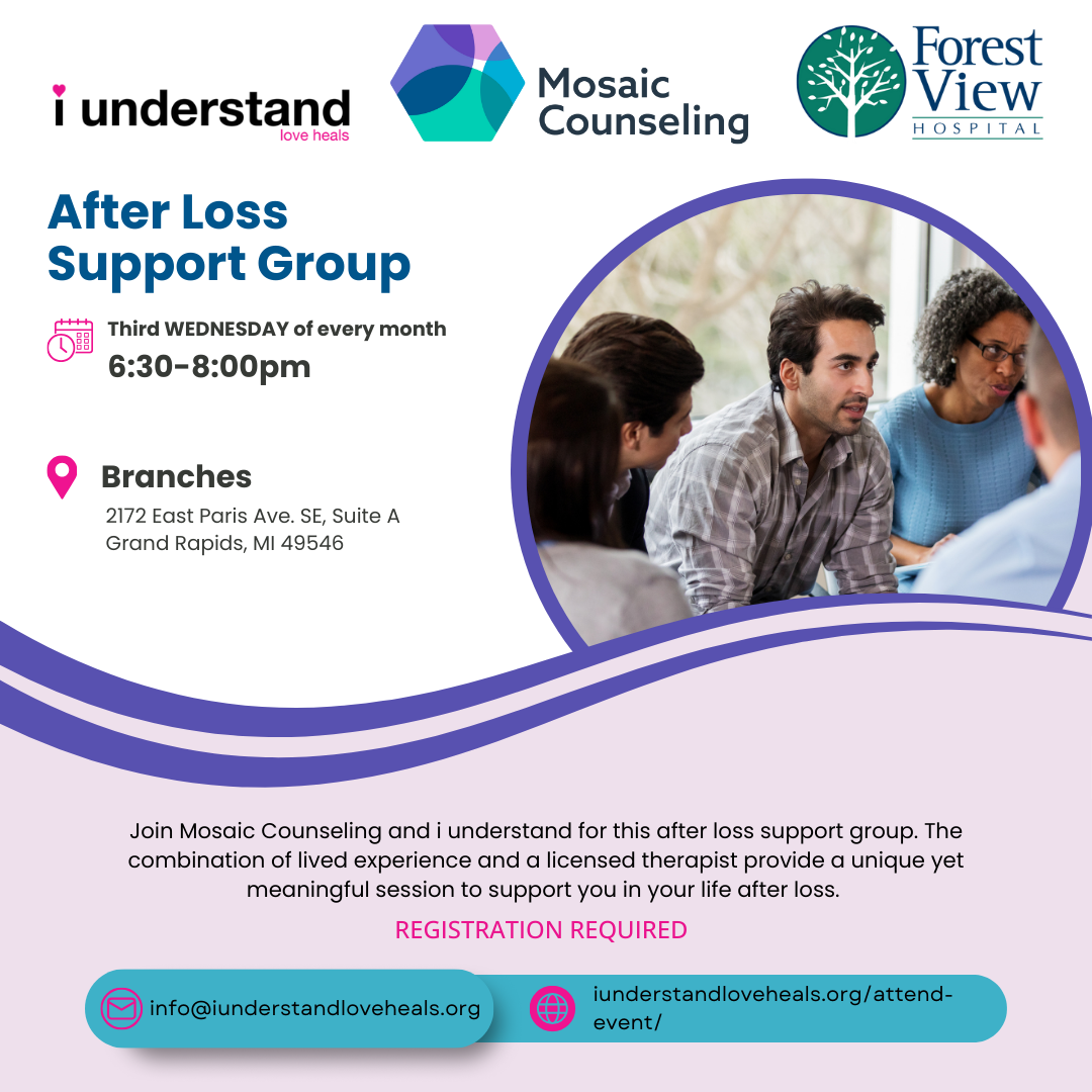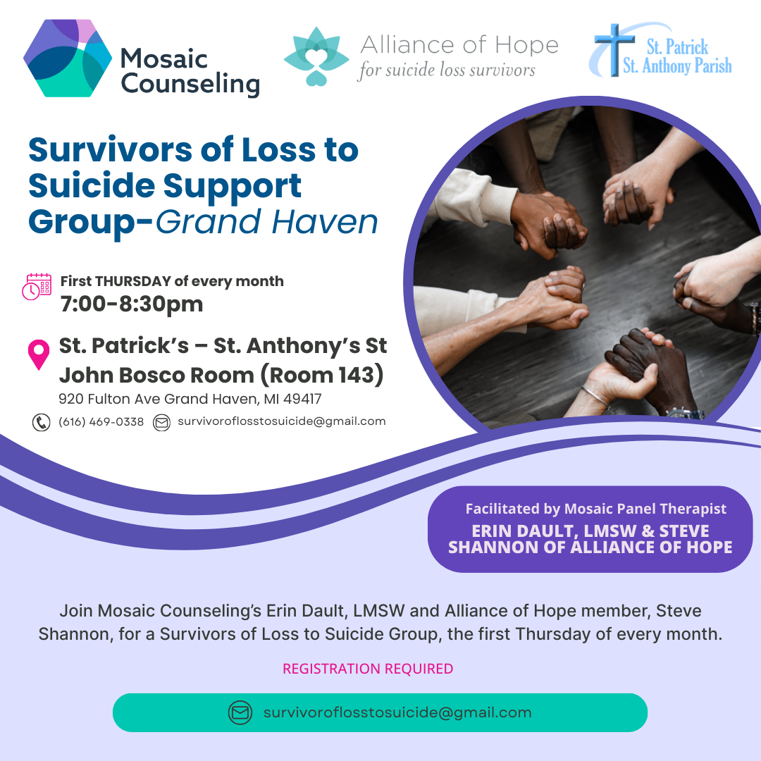 Join Mosaic Counseling’s free community support groups in West Michigan, offering compassionate spaces for healing after loss, suicide, and life challenges. Find connection, hope, and support—no insurance required.